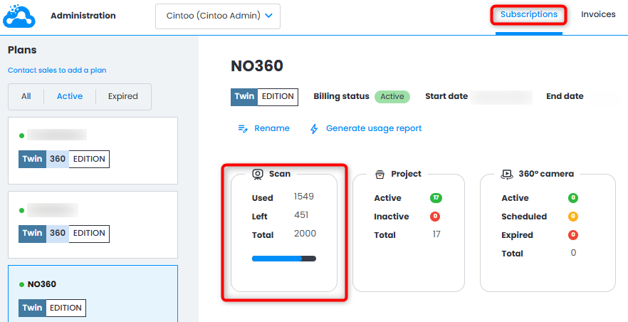 Berechtigungen: Nur Benutzer mit der Rolle Kontoinhaber oder Administrator eines Cintoo-Kontos können ihre Scan-Kapazität und Nutzung überprüfen.