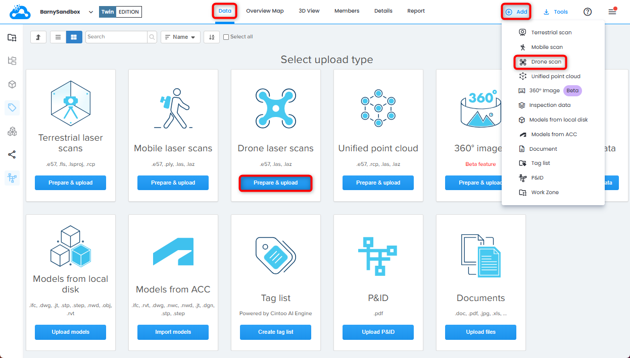 1. Öffnen Sie die Daten Registerkarte und klicken Sie auf Vorbereiten & hochladen auf der Kachel Drohnen-Laserscans oder klicken Sie auf Drohne scan aus dem Menü Dropdown oben rechts. Cintoo Connect wird gestartet.
