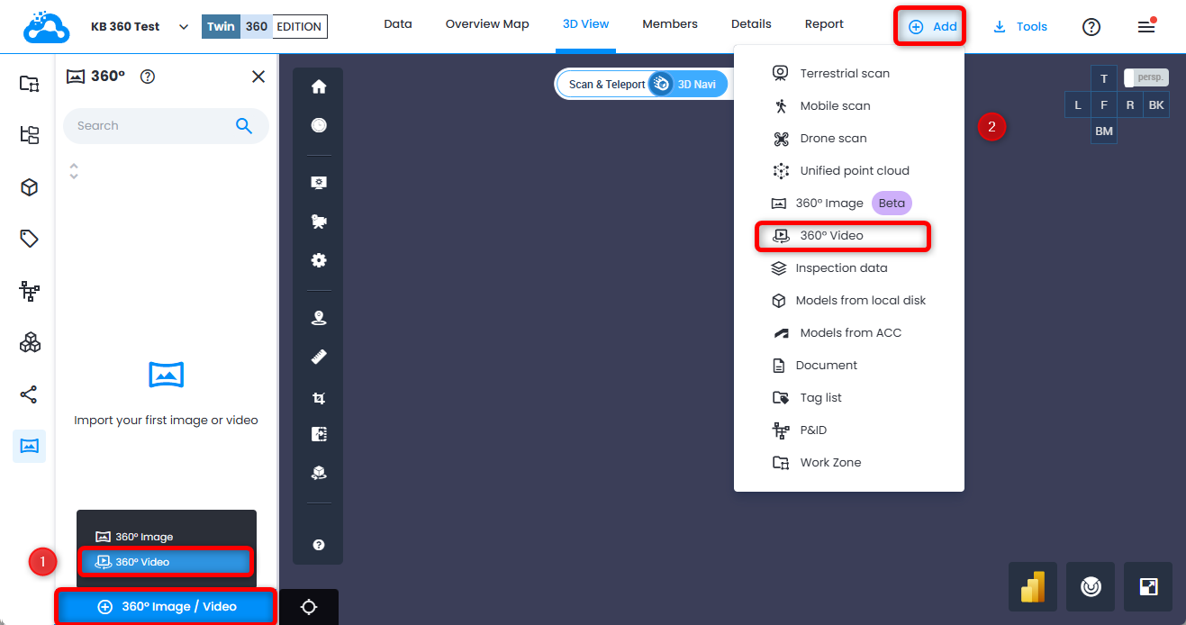 Zwei Optionen zum Importieren von 360-Videodaten.