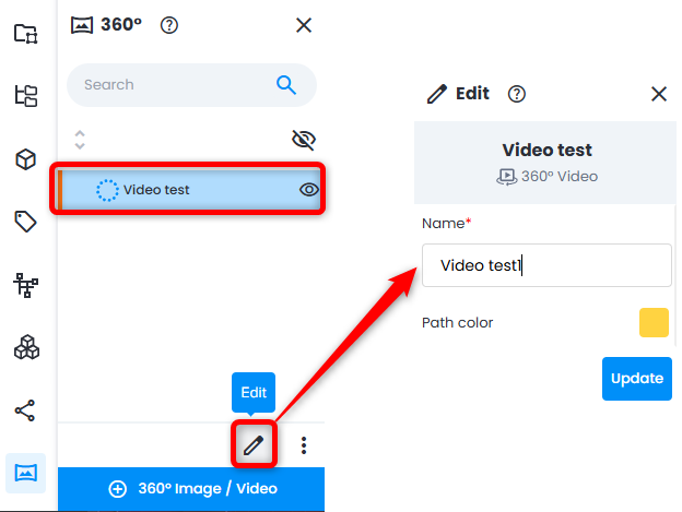 Bereits zu diesem Zeitpunkt ist es möglich, Name und Pfadfarbe zu ändern, indem Sie auf das ladende Video und im unteren Bedienfeld auf Bearbeiten klicken. Klicken Sie auf Aktualisieren , um Änderungen zu speichern.