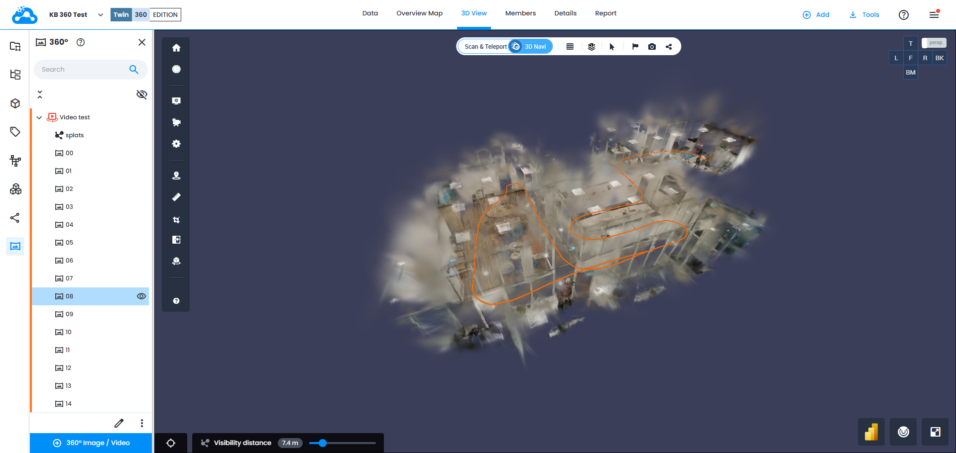 Das importierte Ergebnis in der 3D-Ansicht sieht wie folgt aus – farbiger Pfad, Gaußscher Splat darum herum und die Möglichkeit, durch Klicken auf verschiedene Teile des Pfads zu einzelnen Videobildern (360-Bilder) zu navigieren.