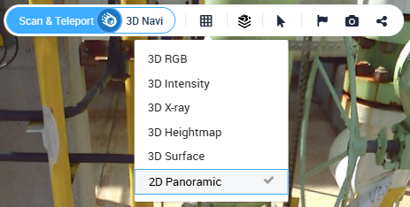 Allows to toggle between various display modes: RGB, Intensity, X-Ray, Heightmap, Surface, and 2D Panoramic Display (Scan mode only).