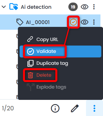 5. Once search process is complete, go through the validation step. Each tag detected automatically comes with confidence metadata that can be found in Properties. Each tag created by AI Detection by default has status Need validation.