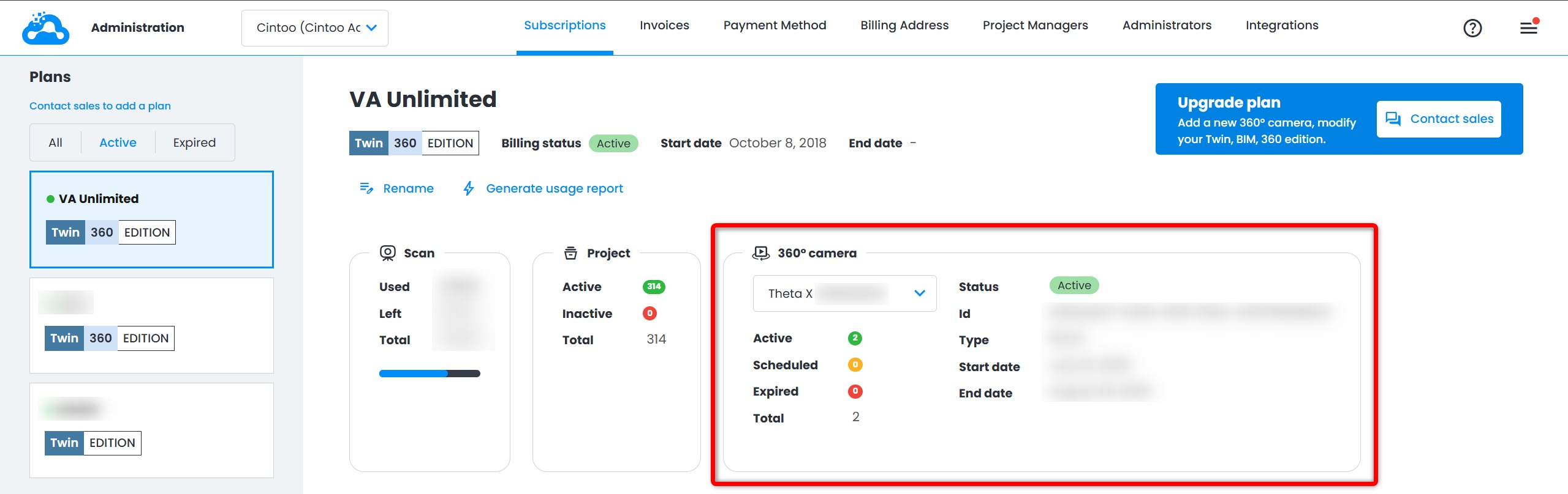 - Verify 360 camera appears as active for your subscription in Administration → Subscriptions