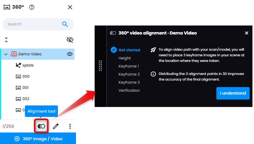 - Always align - always align 360 video with your 3D project data whenever 3D data (scan/model) is available.