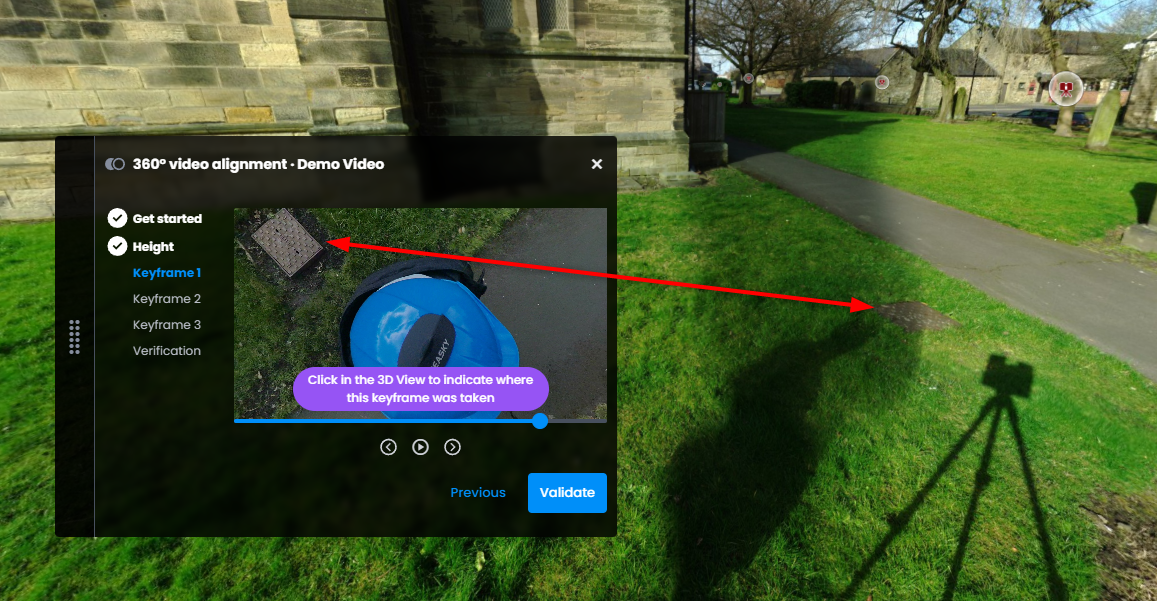 Recommendation: choose frames at well-separated positions along the path and with clearly identifiable features visible in both 360 image and scan/model for the best alignment results.- Select a 360 frame from the video by moving along with buttons