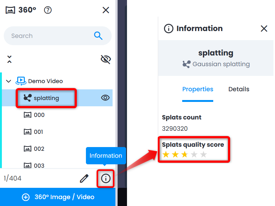 - Splats quality score giving an idea on both acquisition parameters (motion speed while capturing, luminosity of the environment, motion blur, absence of long stops) and reconstruction being basically an evaluation on how well the algorithm processed 360 video.