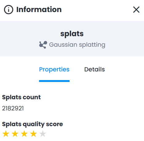 - Splats count allowing to have an additional quality check (value too low - sign of a poor quality)