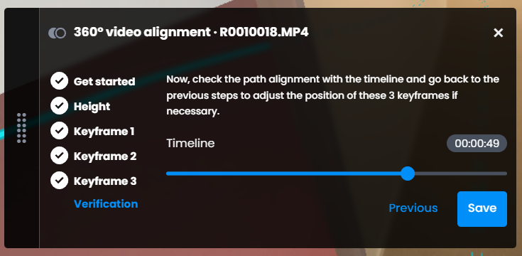 - Use the timeline slider to navigate through frames and visually confirm that 360 images and point cloud/model are properly aligned.