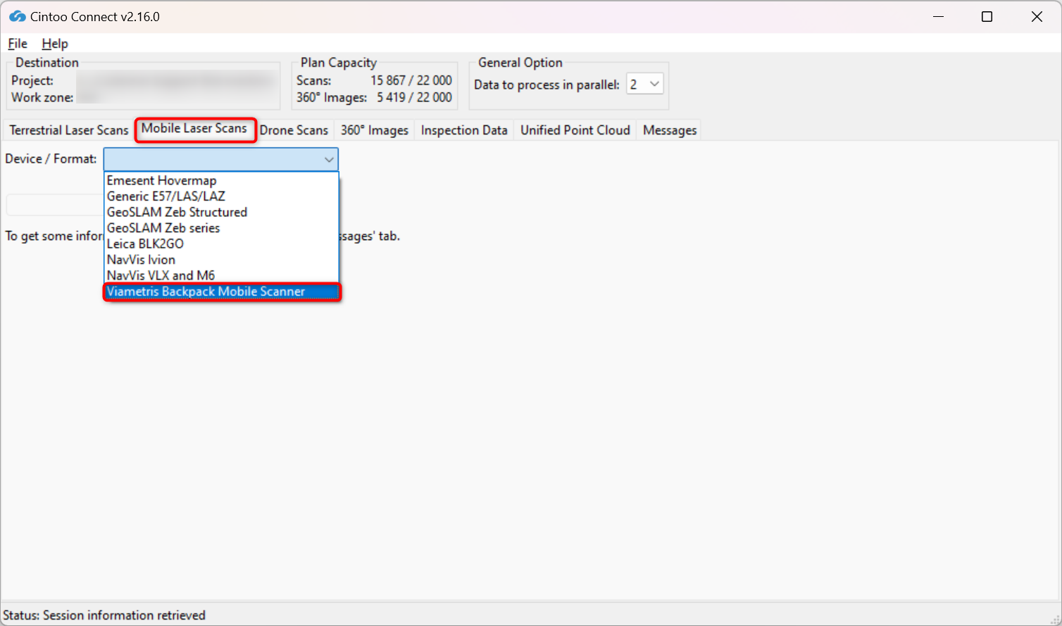 2. Dans l'onglet Balayages laser mobiles, sélectionnez Scanner mobile Viametris Backpack.