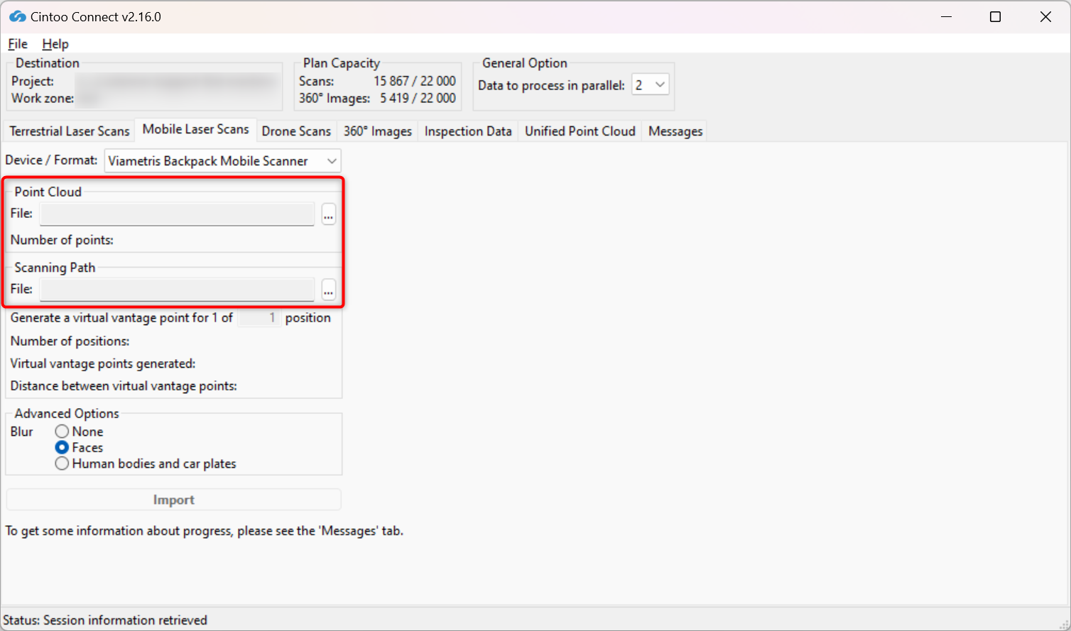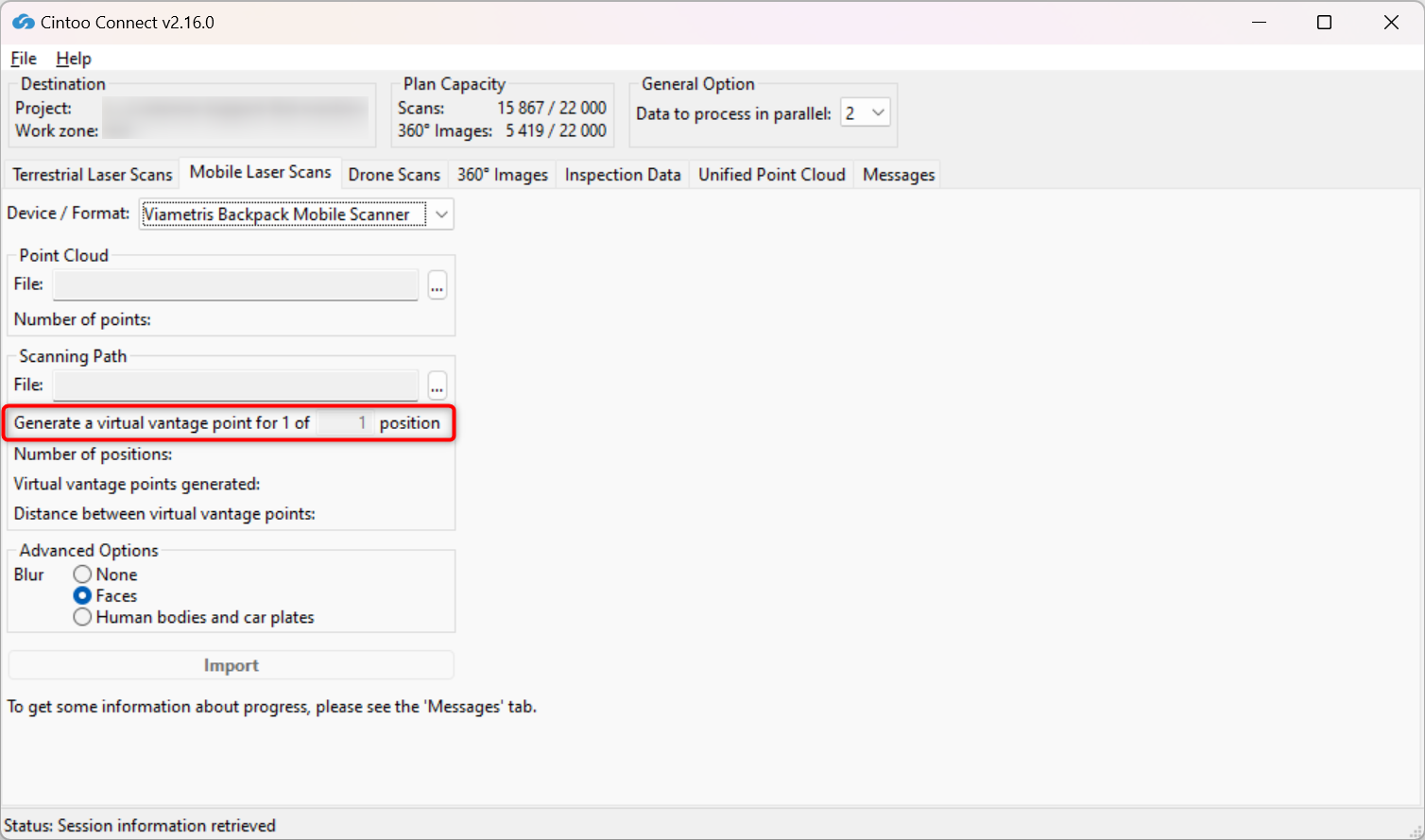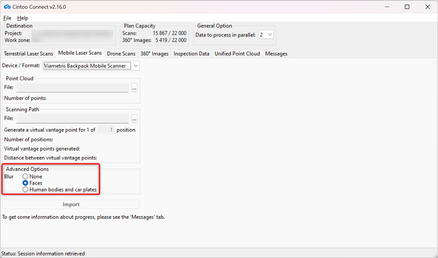 - Les fichiers téléchargés sans l'option Floutage des visages activée doivent être supprimés du projet Cintoo et recréés avec l'option cochée pour appliquer le floutage automatique des visages.