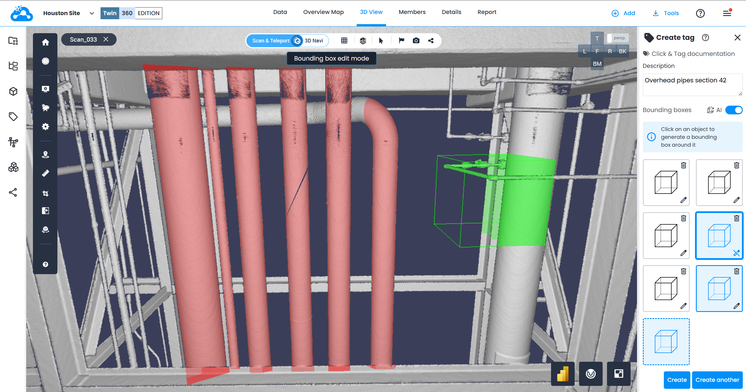 Ces étiquettes d'un Jumeau Numérique ou d'un modèle CAO seront affichées comme des boîtes englobantes superposées sur des scans, avec la possibilité de modifier chaque boîte pour correspondre à la réalité, ou de modifier la liste pour ajouter plus de métadonnées.