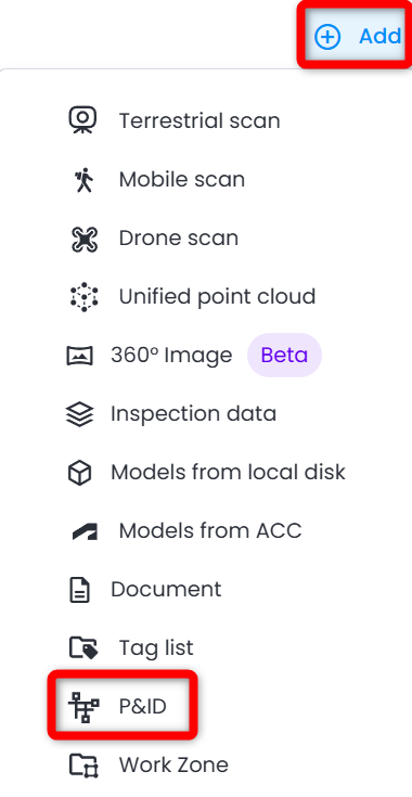 1. Dans le menu déroulant Ajouter en haut à droite, choisissez P&ID. Si dans une zone de travail vide, choisissez sur une tuile. CHANGEMENT DE CAPTURE D'ÉCRAN pour inclure la tuile quand elle n'est pas grise.