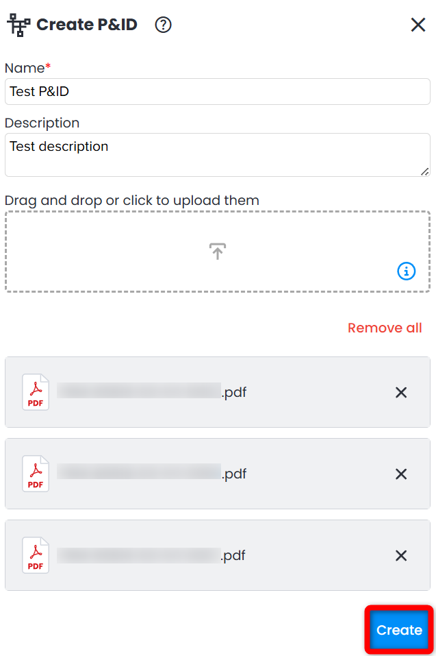 2. Dans le menu Créer P&ID ouvert, choisissez Nom, Description si nécessaire, et ajoutez les fichiers au format PDF en tant que pages (il est possible d'en ajouter plusieurs à la fois). Cliquez sur les croix pour supprimer des fichiers individuels en cas d'erreur ou cliquez sur Supprimer tout pour recommencer. Pour importer des données, cliquez sur Créer.