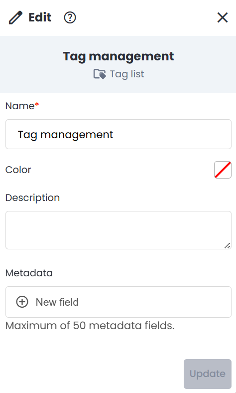 3. In Edit tag list panel Name, Color, Description, and Metadata fields can be modified at any time.
