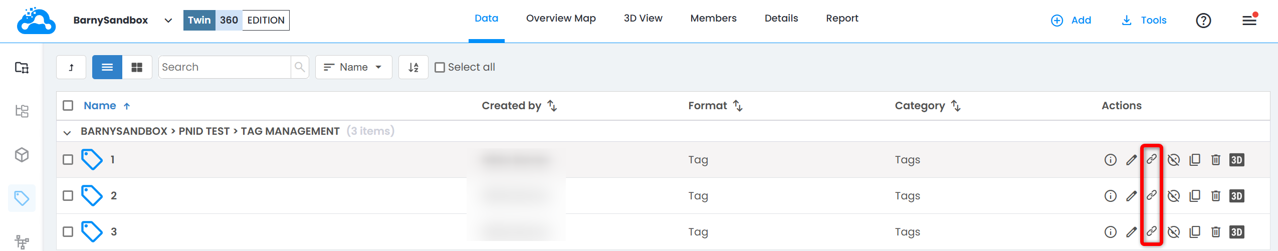 4. Use Action icons on the right side of the screen to view tag details or to open a tag in 3D View (Play 3D). Note that clicking on a tag opens tag list in Data tab.