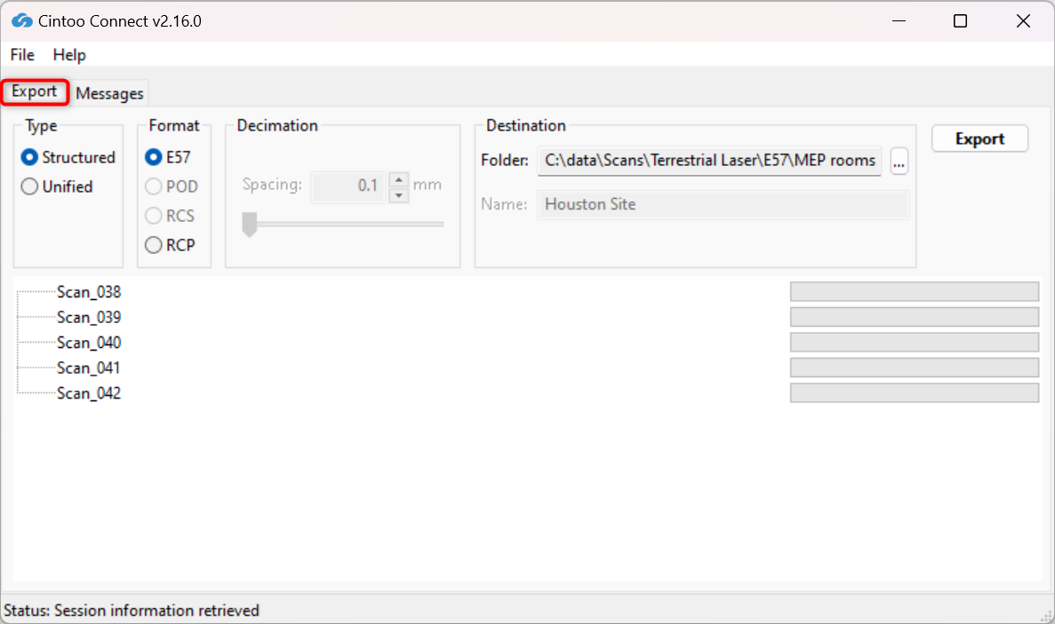 Scan data can be exported as a structured E57 or structured RCP file. Hover over options to learn more about them.