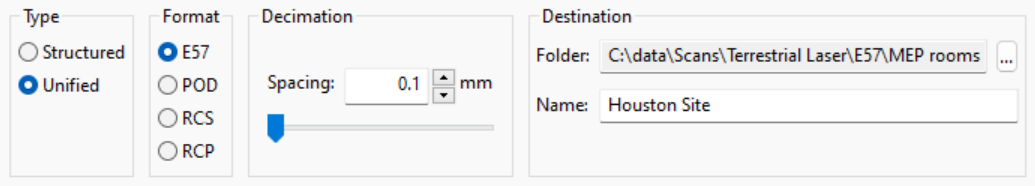 Scan data can also be exported as a unified E57, RCP, RCS (Autodesk ReCap format), or POD (Bentley Point Tools) file, resulting in one globally decimated unified point cloud.